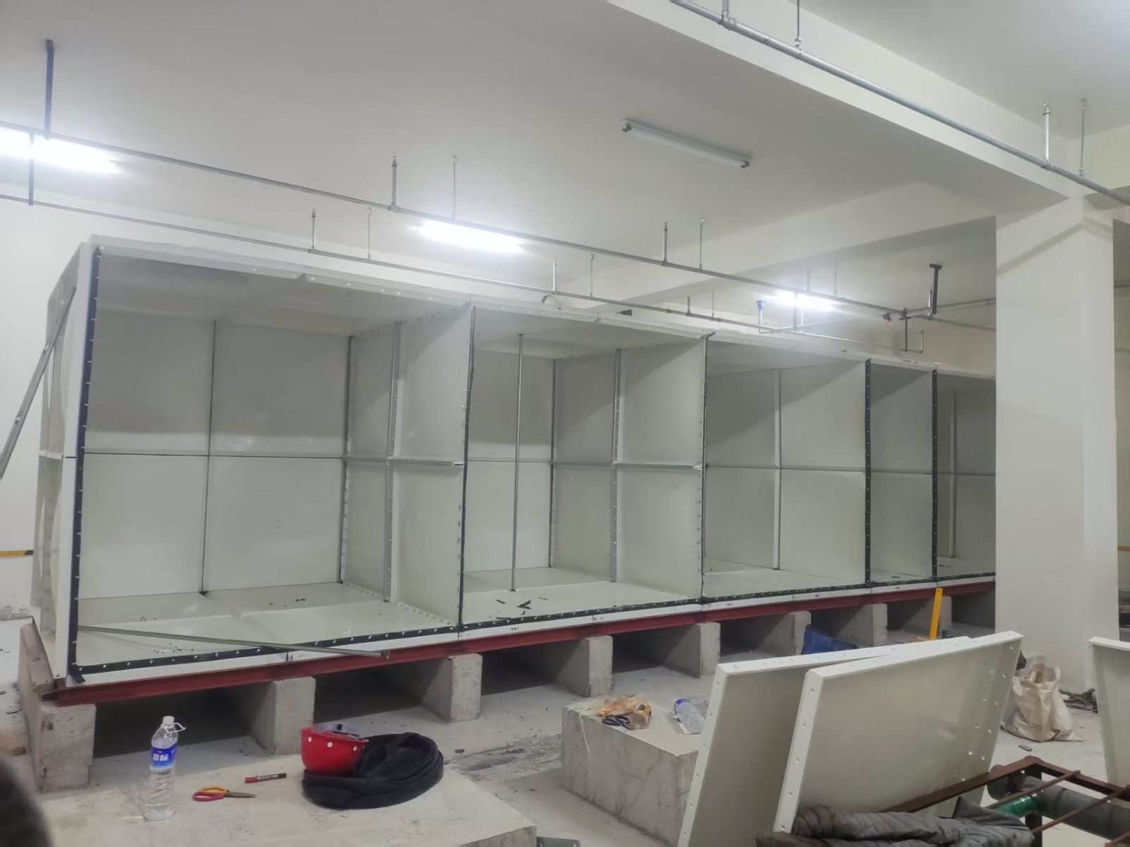 SMC組合式玻璃鋼水箱是一種普遍采用的儲(chǔ)水方式。是由SMC單元板現(xiàn)場(chǎng)組裝而成的一種水箱。單元板用SMC(sheet moulding compound)片材在高溫高壓下模壓成型,水箱內(nèi)采用加強(qiáng)式支撐,其鋼配件選用熱鍍鋅件和不銹鋼件均可。板塊厚度的選取依據(jù)板塊所受的壓力和所處的位置。有5mm、8mm、10mm、12mm、14mm、16mm等。
